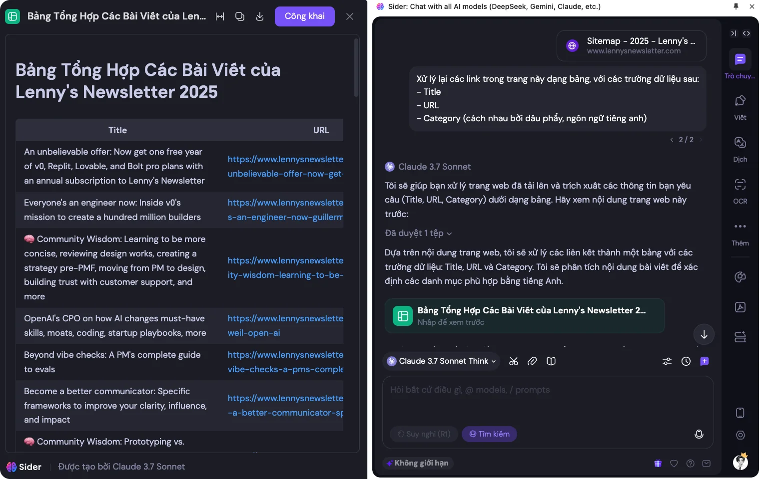 Thế là mình gõ prompt, nhờ AI đọc nội dung trang sitemap, xử lý và xuất ra bảng dữ liệu đúng format mình cần.