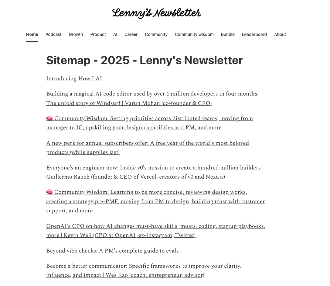 Bước đầu tiên dĩ nhiên là cần có danh sách link của tất cả bài viết. May sao, bác Lenny đã tổng hợp sẵn theo năm ở trang sitemap: https://www.lennysnewsletter.com/sitemap