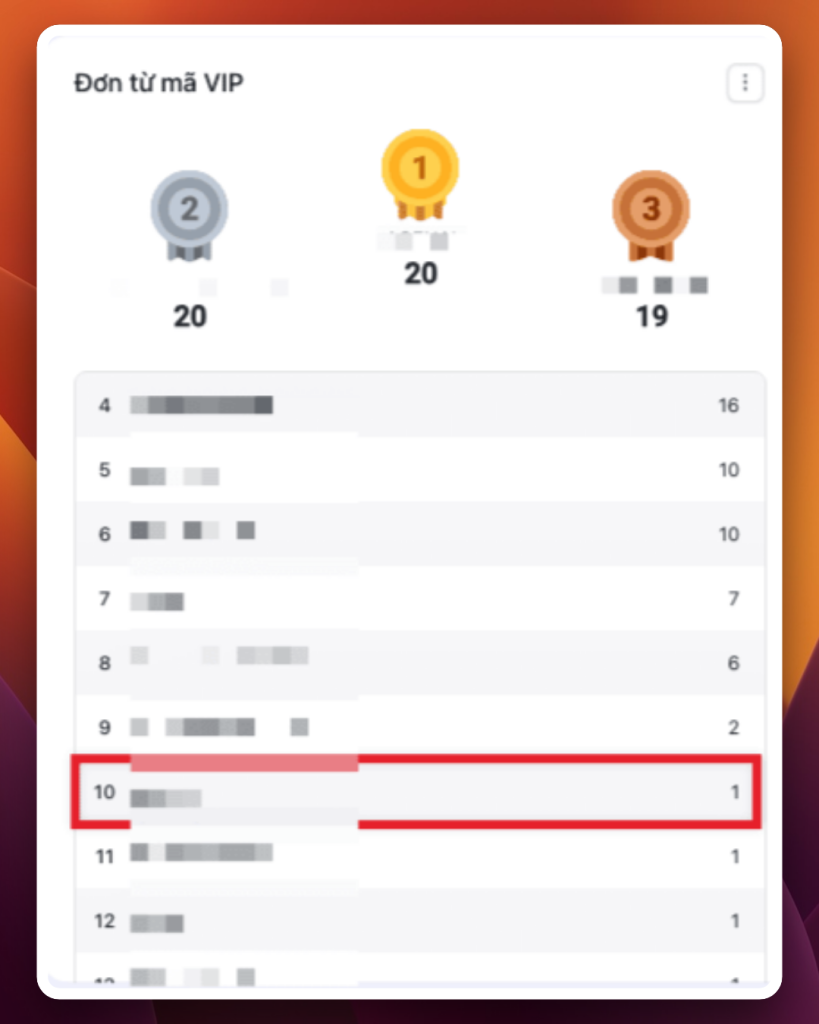 Và bất ngờ, một mã giảm 100% nội bộ xuất hiện trên Leaderboard… tá hoả luôn! Cũng may là có dashboard đó, nếu chỉ dựa vào danh sách đơn hàng, khả năng cao là mình đã lướt qua mà không để ý.
